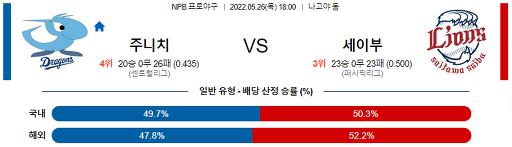 전일 경기에서는 세이부가 2-1 승리를 기록하며 시리즈 2연승에 성공했다. 3연승 흐름 속에 시즌 22승23패 성적. 홈 플레이트 근처에서 변화가 심한 좋은 구질을 보유하고 있는 우완 언더핸드 요자 카이토 투수가 6이닝 1실점 승리투를 기록했고 야마카와의 홈런포 포함 5안타를 기록한 경기. 반면, 주니치는 7연패 흐름 속에 시즌 20승26패 성적. 투타의 엇박자 현상이 길어지고 있으며 4안타 빈공에 그쳤던 상황.