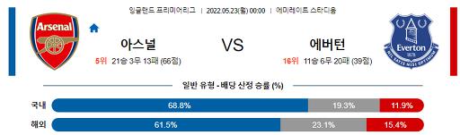 양 팀의 최근 4경기 중 3경기에서 오버 ▲(2.5 기준)가 나온 점을 고려한다면, 오버 ▲(2.5 기준)의 가능성이 높겠다. 또한 후술하겠지만, 아스날의 시즌 막바지 분위기는 매우 좋지 않다. 크고 작은 부상으로 팀이 흔들리며 전체적인 에너지 레벨이 떨어진 상황. 반면, 에버튼은 잔류에 대한 열망 하나로 매우 뛰어난 에너지 레벨을 보여주며 대부분의 경기에서 승리를 따냈다. 분위기가 매우 좋은 상황으로, 이번 일정도 에버튼의 승리가 예상된다. 참고로 에버튼은 아스날을 상대로 3연승을 거두고 있다.