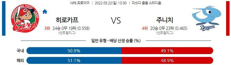 2021시즌 11승6패 2.20을 기록한 야나기 유야 투수는 직전경기(5/15) 원정에서 요미우리 상대로 7이닝 6피안타(2홈런) 2볼넷 8K, 2실점 승리를 기록했으며 이전경기(5/8) 홈에서 한신 상대로 7이닝 6피안타(1홈런) 무사사구 10K, 3실점(2자책) 노디시전을 기록했다. 2연승 흐름 속에 올시즌 7경기 4승1패, 5경기 QS(완봉 1회+ 완투 1회) 성적이며 최근 3경기 2승, 21이닝 5실점의 기록. 올시즌 7차례 등판중 2경기에서는 힘으로 윽박지르는 투구가 제구에 문제를 보이면서 아쉬움을 남겼지만 나머지 5경기에서는 짠물 투구를 선보이며 지난시즌 센트럴리그 평균자책점과 탈삼진 1위(168K)를 기록한 투수의 위력을 선보였다. 올시즌 상대전 2경기 2승, 0.00 기록이 있다.