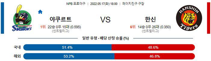 야쿠르트는 일요일 원정에서 히로시마 상대로 연장전 승부 끝에 5-5 무승부를 기록하며 시리즈 1승1무를 기록했다. 2연승 흐름 속에 시즌 22승15패 성적. 5회 까지 2-5로 끌려가던 경기를 동점으로 만드는 저력을 보여줬고 무라카미가 홈런포를 쏘아올리며 컨디션을 끌어올리고 있는 모습. 반면, 한신은 일요일 원정에서 요코하마 상대로 8-1 승리를 기록하며 시리즈 2승을 기록했다. 2연승 흐름 속에 시즌 14승26패 성적. 이틀 연속 타선이 폭발했고 애런 월커슨 투수가 6이닝 1실점 승리투를 기록한 경기.