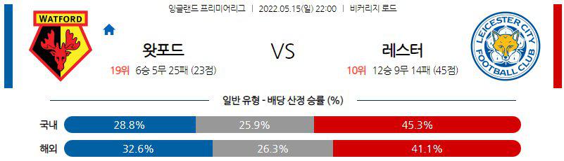 레스터의 승리가 유력하다. 적어도 동기부여가 사라진 강등권 팀을 상대로 패배하는 모습은 보여주지 않고 있으며, 왓포드의 공격진 뎁스는 부상으로 인해 누수가 매우 큰 상황이다. 다만 레스터가 지속적으로 보여주고 있는 수비 불안 문제는 변수라고 볼 수 있다. 이를 고려해 오버(2.5) 쪽으로 접근하는 것 역시 확률이 높은 선택이 될 것이다.