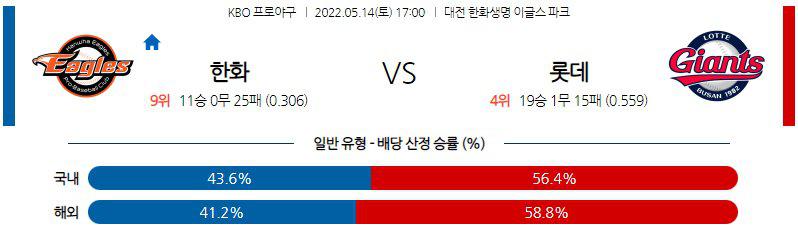 전일 경기에서는 롯데가 8-1 승리를 기록하며 시리즈 기선제압에 성공했다. 최근 4경기 3승1패 흐름 속에 시즌 19승15패 성적. 안치홍이 만루홈런 포함 3안타, 6타점을 기록하는 맹폭을 퍼붓고 반즈 투수의 6이닝 무실점 승리투가 나온 경기. 반면, 한화는 8연패 흐름 속에 시즌 11승25패 성적. 선발 김민우 투수가 1.2이닝 5실점 패배를 기록했고 6안타에 그치는 가운데 9회 1득점을 기록하며 무득점 패배를 모면한 것에 만족해야 했던 경기.