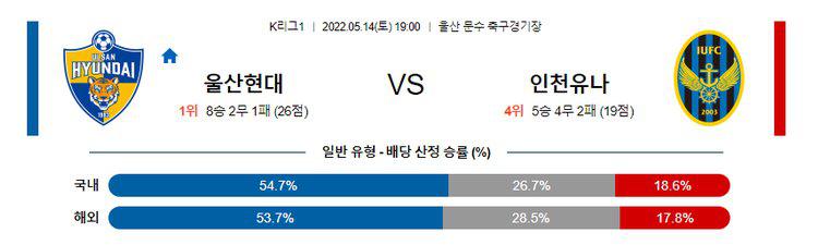 변수가 없는 한 울산의 공격력이 매우 좋기 때문에 직전 리그 4경기 중 3경기에서 오버(2.5 기준)가 나온 점, 인천의 최근 수비력이 좋지 않아 직전 리그 4경기 중 3경기에서 오버(2.5 기준)가 나온 점을 고려하면 오버(2.5 기준)의 가능성이 매우 높겠다. 또한 직전 경기에서 양 팀은 큰 '차이'를 보였다. 울산은 위기의 상황에서도 '강팀'의 모습을 보이며 승리를 거둬 1위를 유지했고, 인천은 무기력하게 무너지며 어느덧 '4위'까지 내려왔다. 이번 일정에서도 그 차이는 존재할 것으로 보인다. 울산 승 / 오버(2.5 기준)를 추천한다.
