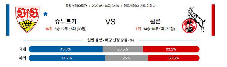 쾰른의 승리를 점친다. 공격력으로 봤을 때 슈투트가르트에게 높은 점수를 주기 어렵다. 그나마 최근 복귀했던 주포도 이번에 결장할 전망. 쾰른도 주포에게 득점을 의존하는 비중이 매우 높기는 했지만 명확한 공격 플랜으로 인상적인 모습을 보이는 데는 성공했다. 다만 쾰른 역시 90분 내내 라인을 올리고 압박하는 적극적인 성향 상 후반 실점이 잦은 팀이다. 홈 팀의 만회 가능성을 보고 오버(2.5)를 픽하는 것도 좋은 선택이다.