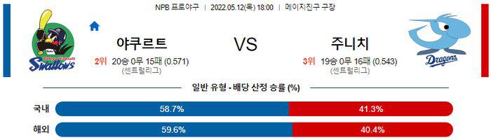 전일 경기에서는 주니치가 2-0 승리를 기록하며 시리즈 2연승에 성공했다. 2연승+ 최근 5경기 4승1패 흐름 속에 시즌 19승16패 성적. 팽팽한 투수전 흐름에서 마르티네즈의 2경기 연속 홈런포가 나왔고 10안타를 기록한 경기. 반면, 야쿠르트는 2연패 흐름 속에 시즌 20승15패 성적. 마운드는 제 몫을 해냈지만 1안타로 침묵하면서 2경기 연속 무득점 패배를 기록한 상황.