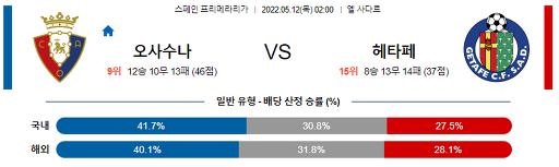 5월12일 02:00 오사수나 헤타페 라리가◈ 오사수나 (리그 9위 / 승승패무무)