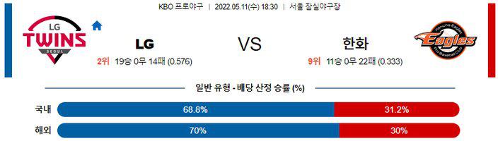 전일 경기에서는 LG가 9-1 승리를 기록하며 시리즈 기선제압에 성공했다. 4연승 흐름 속에 시즌 19승14패 성적. 김현수가 4안타를 기록하며 이끈 타선이 15안타(1홈런)를 폭발시켰고 이민호 투수가 공격적인 마운드 운영을 선보이며 6이닝 1실점 호투를 펼친 경기. 반면, 한화는 5연패 흐름 속에 시즌 11승22패 성적. 선발 장민재 투수가 5이닝 1실점으로 잘 던졌지만 바통을 이어받은 불펜이 무너졌고 5안타, 병살타 1개, 5개 잔루를 남긴 경기.