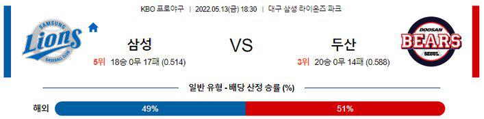 삼성은 목요일 홈에서 SSG 상대로 4-2 승리를 기록하며 시리즈 2승1패를 기록했다. 2연승 흐름 속에 시즌 18승17패 성적. 원태인 투수의 7이닝 2실점 승리투가 나왔고 9안타(1홈런)를 기록한 경기. 반면, 두산은 목요일 원정에서 키움 상대로 3-2 승리를 기록하며 시리즈 3승을 기록했다. 3연승 흐름 속에 시즌 20승14패 성적. 반신지 투수가 5.1이닝 1실점 승리를 기록했고 3안타로 3득점을 만들어 낸 경기. 시즌 첫 스윕 승리였기에 기쁨도 배가 되었다.