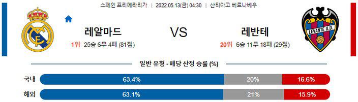 레반테의 득, 실점이 주소모두 많아 최근 5경기 중 4경기에서 다득점 페이스가 나온 점, 레알마드리드 역시 득점력이 좋아 최근 5경기 중 4경기에서 다득점 페이스가 나온 점을 고려하면 오버(3.5 기준)의 가능성이 매우 높겠다. 또한 레반테의 최근 흐름이 좋긴하지만, 강등권 탈출은 여전히 6점이나 남아 있으며 여전히 객관적인 전력 상으로나 순위 상으로 레알마드리드가 우위에 있다. 직전 경기에서 '핵심 공격수' 벤제마와 비니시우스가 휴식을 취했기 때문에 이번 일정에서 실점이 잦은 레반테를 상대로 다득점과 함께 승리를 챙길 것으로 보인다.