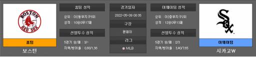 5월9일 00:35 MLB 보스턴 : 화이트삭스보스턴의 선발투수는 우완 마이클 와카다.