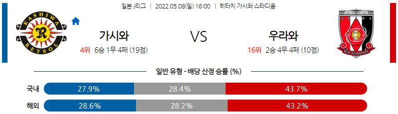 가시와의 최근 실점이 잦아져 직전 5경기 중 3경기에서 오버(2.5 기준) 가 나온 점, 양 팀의 최근 3차례 맞대결에서 2번의 오버(2.5 기준)가 나온 점을 고려하면 오버(2.5 기준)의 확률이 더 높겠다. 후술하겠지만, 가시와가 비록 기복있는 경기력을 보여주고 있으나, 여전히 높은 순위를 차지하고 있으며, 우라와는 강등권에 위치해 있다. 또한 우라와는 아시아챔피언스리그 여파로 인해 체력적인 부담을 느끼고 있는 상황.