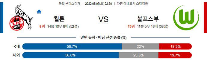 쾰른의 최근 4경기 중 모든 경기에서 오버(2.5 기준)가 나온 점, 볼프스부르크의 최근 원정 4경기 중 3경기에서 오버(2.5 기준)가 나온 점을 고려하면 오버(2.5 기준)의 가능성이 매우 높겠다. 또한 후술하겠지만, 쾰른의 최근 기세가 무서운 반면, 볼프스부르크는 기복 있는 경기력을 보여주고 있다. 특히 홈, 원정에서의 차이가 심한 편. 원정에서 유독 수비력이 약하며 주전 수비수들의 줄부상까지 겹친 볼프스부르크를 상대로 최근 컨디션이 올라온 쾰른의 공격진이 맹폭을 가할 것으로 보인다.