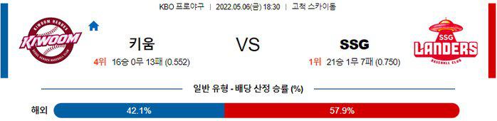 키움은 목요일 원정에서 기아 상대로 1-10 패배를 기록하며 시리즈 1승2패를 기록했다. 2연패 흐름 속에 시즌 16승13패 성적. 이날 경기에서 마운드에 올라온 4명의 투수가 주소모두 실점을 허용했고 1안타 빈공에 그쳤던 경기. 반면, SSG는 목요일 홈에서 한화 상대로 14-4 승리를 기록하며 시리즈 2승1패를 기록했다. 시즌 21승1무7패 성적. 14안타(1홈런)를 폭발시켰고 노바 투수의 7이닝 3실점 QS 투구가 나온 경기.