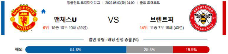 브렌트포드가 원정에서 수비적으로 틀어막은 후 빠른 전개를 더욱 자주 시도하기 때문에 원정 득점이 더 많다는 점과 양 팀 최근 5경기 중 3경기에서 오버(2.5 기준)가 나온 점을 고려하면 오버(2.5 기준)의 가능성이 높겠다. 또한 후술하겠지만, 맨체스터유나이티드는 선수들의 부진과 부상이 겹치면서 최근 좋지 않은 흐름을 이어가고 있다. 반면, 브렌트포드는 상승세를 타고 있는 중이다. 여기에 맨체스터유나이티드의 결장 선수도 리그 내 최다이기 때문에 맨체스터유나이티드의 순위가 더 높더라도 지난 몇 경기와 같이 승리를 따내지 못할 것으로 보인다. 무승부 / 오버(2.5 기준)를 추천한다.