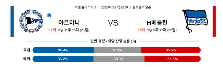 헤르타베를린의 승리를 점친다. 최근 기세에서도 앞서고 있으며, 빌레펠트의 최근 경기력과 수비력은 완전히 바닥을 찍고 있다. 다만 헤르타베를린 공격진 누수로 인해 완벽한 경기력이 나오기를 바라기 어렵다. 빌레펠트의 공격력 역시 매우 좋지 못함을 고려하면 저득점 가능성이 근소하게 높은 매치다.