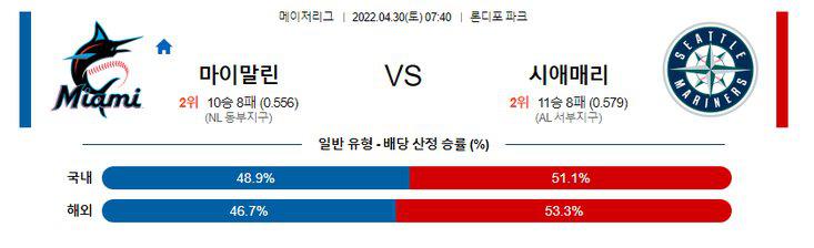 마이애미는 직전 워싱턴과의 3연전에서 스윕!! 5연승 행진중이다. 반면 시애틀은 템파베이와의 3연전에서 루징시리즈를 기록한 상황!! 그리고 오늘부터 두팀간 3연전이 펼쳐지게 되는데 승리는 시애틀이 기록할 전망이다. 일단 두 선발주소모두 불안요소가 있으니 오늘은 불펜/타선에서 승부가 갈릴것으로 예상된다. 객관적인 전력으로만 봐도 시애틀이 불펜경쟁력에서 앞서는 상황이고 좌타자가 포진되어있는 시애틀 타선이 좌타 약점이 있는 에르난데스를 상대로 활약해줄 가능성이 크겠다. 따라서 오늘경기는 시애틀 사이드로 봐야하는 경기가 되겠다.