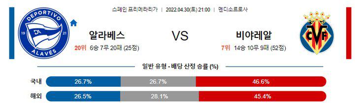 비야레알이 최근 후반 실점률이 많은 반면 알라베스는 후반 득점률이 많기 때문에 상성인 양 팀 특성 상 다득점 페이스가 될 가능성이 높다. 양 팀의 최근 5차례 맞대결에서도 주소모두 오버(2.5 기준)가 나온 것도 참고하면 좋다. 또한 비야레알은 이번 시즌 챔피언스리그 경기를 전, 후로 흔들리는 모습을 보여왔다. 지난 16강전 이후 카디스전에서 패했으며 8강 뮌헨전 이전에 레반테에게도 패한 경험이 있다. 여기에 강등권 탈출이라는 뚜렷한 목표를 가진 알라베스보다 유로파리그 티켓도 경쟁도 어려운 비야레알의 동기부여가 다소 떨어질 것으로 보인다. 알라베스 승 / 오버(2.5 기준)를 과감히 추천한다.