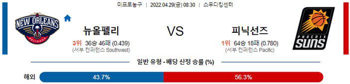 데빈 부커의 이탈 공백을 메우는 플랜B가 자리를 잡아가기 시작한 피닉스의 경기력이 나온 상황. 원정경기 일정이지만 정규시즌 64승을 기록하며 구단 역대 최다승 기록을 갈아치운 피닉스가 패스게임을 통해서 찬스를 만드는 능력과 기본적인 수비력에서 뉴올리언즈 보다 우위에 있는 전력 이라고 생각된다. 피닉스 승리 가능성을 추천 한다.