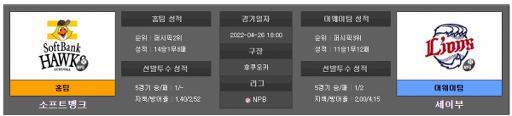 무엇보다 세이부의 타선이 부진하지만 투수력에서는 안정적인 흐름을 이어가고 있다는점에서 좋은 흐름을 기대해 볼 수 있을것으로 보인다.