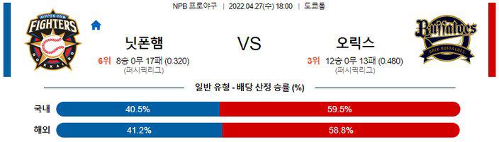 중립구장 경기로 펼쳐지는 경기다. 선발 싸움 싸움에서 미야기 히로야 투수의 손을 들어줄수 있는 경기가 되며 전일 경기 연장전 승부의 결과 역시 수요일 경기에 영향을 줄것이다. 또한, 코디 폰스 투수는 제구 불안의 꼬리표를 떼지 못한 투수다. 오릭스 승리 가능성을 추천 한다.