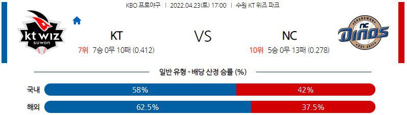 전일 경기에서는 KT가 4-3 승리를 기록하며 시리즈 기선제압에 성공했다. 4연승 흐름 속에 시즌 7승10패 성적. 지난시즌 9승을 기록했지만 올시즌 초반 만족할수 없는 행보를 보이고 있던 배제성 투수가 5.1이닝 2실점 승리투로 올시즌 첫 승리를 기록했고 라모스가 결승 투런 홈런을 기록한 타선은 디펜딩 챔피언의 DNA가 살아난 모습. 반면, NC는 2연패 흐름 속에 시즌 5승13패 성적. 상대와 동일한 10안타 경기를 했지만 홈런이 없었고 12개 잔루를 남기는 답답한 결정력이 나타난 경기.
