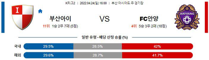 부산의 공격력이 좋지 않아 최근 7경기 중 6경기에서 언더(2.5 기준)가 나온 점을 고려하면 언더(2.5 기준)의 가능성이 높겠다. 또한 안양이 최근 2경기 무승을 거두긴 했지만 상위 2팀을 상대로 거둔 결과였으며 이전까지 6경기 무패를 거두고 있었다. 이번 시즌 맞대결에서도 안양이 1-0 승리를 거뒀다. 반면 부산은 좀처럼 분위기가 나아질 기미가 보이지 않으며 팀 창단 이래로 최악의 시즌을 보내고 있다. 심지어 이번 시즌 1승도 거두지 못한 안산보다도 순위가 낮은 상황. 본 일정도 안양의 승리가 점쳐지며 핸디캡(H+1.0) 까지도 노려볼 만 하다.