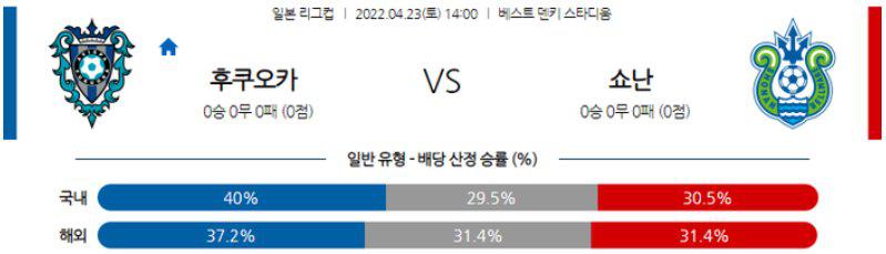 후쿠오카의 근소 우위를 점친다. 부진한 공격력이 컵대회에서는 나아지는 모습을 보여주고 있고, 수비력은 기대에 미치는 활약을 보여주고 있다. 반면 쇼난은 에너지레벨을 끝까지 유지하지 못하며 후반 약점을 드러내고 있다. 주도권은 쇼난이 잡지만 후쿠오카 수비력에 막히고 후반에 약점을 공략당할 것이다. 언더(2.5)와 홈 승을 점친다.
