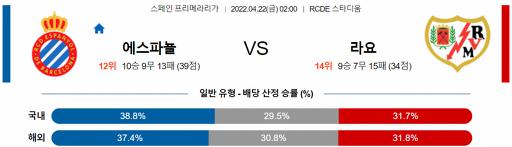 프리메라리가 4월 22일 02:00 RCD 에스파뇰 : 라요 바예카노