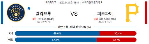 4월 20일 08:40 MLB 밀워키 : 피츠버그