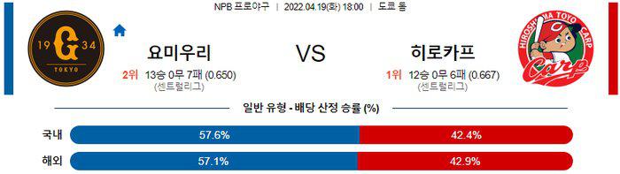 4월5일 선발 맞대결을 펼친 토고 쇼헤이와 구리 아렌 투수가 홈과 원정을 바꿔서 시즌 2번째 격돌한다. 히로시마는 에이스의 선발 경기에서 무기력하게 패배를 당하며 연승이 중단 되었다는 것이 팀 리듬에 있어서 좋지 않다. 또한, 히로시마 좌타자 라인의 타격감이 한풀은 기세가 꺽인 상황. 요미우리 승리 가능성을 추천 한다.