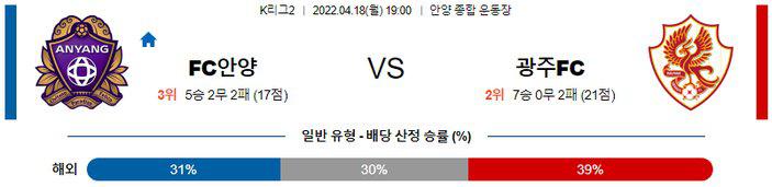 광주가 우세한 승부라고 본다. 안양이 득점력은 뺴어나지만 슈팅을 만들어내는 빈도는 적다. 상위권을 상대로 고전하는 페이스를 보여주고 있기도 하다. 광주가 강한 압박으로 빌드업을 저지하면 공격이 답답해질 확률이 높다. 광주가 대량 득점을 기록한 적은 없다고는 하나, 양팀의 득점력을 고려하면 오버(2.5)를 택하는 것이 좋을 것이다.
