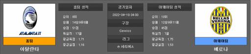 4월19일 세리에A 아탈란타 : 베로나아탈란타는 14승9무8패 승점 51점을 기록하며 리그 8위를 기록중이다.