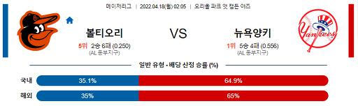 4월 18일 02:05 MLB 볼티모어 : 뉴욕 양키스