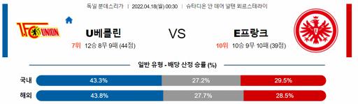 독일 분데스리가 4월 18일 00:30 유니온 베를린 : 아인트라흐트 프랑크푸르트