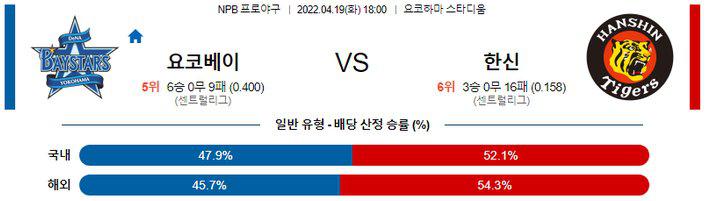 요코하마는 일요일 홈에서 야쿠르트 상대로 4-5 패배를 기록하며 시리즈 1승2패를 기록했다. 최근 5경기 1승4패 흐름 속에 시즌 6승9패 성적. 5회 까지 4-0으로 앞서 나갔지만 필승조 불펜의 붕괴 속에 역전패를 당한 경기. 반면, 한신은 일요일 홈에서 요미우리 상대로 1-3 패배를 기록하며 시리즈 2승1패를 기록했다. 2연승이 중단 되는 패배가 나왔으며 시즌 3승1무16패 성적. 8안타(1홈런)를 기록하고 5안타(1홈런)에 그친 상대에게 발목을 붙잡힌 경기. 10개 잔루를 남기는 답답한 결정력이 나타났던 상황.