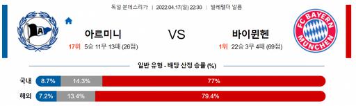 독일 분데스리가 4월 17일 22:30 아르미니아 빌레펠트 : FC 바이에른 뮌헨