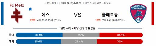 프랑스 리그앙 4월 17일 22:00 FC 메스 : 클레르몽 푸트