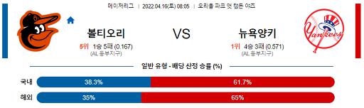 4월 16일 08:05 MLB 볼티모어 : 뉴욕 양키스