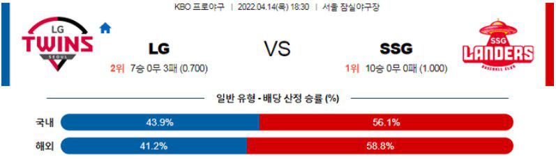 시즌 개막후 언터처블의 모습을 보여주고 있는 월머 폰트 투수이고 SSG는 개막 10연승을 질주하고 있다. 모든 지표가 SSG의 승리를 가르키고 있는 상황. 하지만, 타이밍 승부에서 LG를 노려볼구 있는 구간에 진입했고 LG가 전일 경기에서 적시타가 나오지 않았지만 SSG 불펜을 괴롭히는 가운데 찬스를 쉬지 않고 만들었다는 것을 기억해야 한다. LG 승리 가능성을 추천한다.