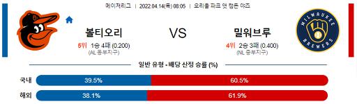 4월 14일 08:05 MLB 볼티모어 : 밀워키