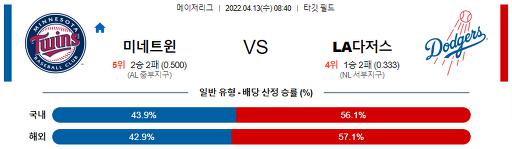 4월 13일 08:40 MLB 미네소타 : LA다저스