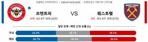 잉글랜드 프리미어리그 4월 10일 22:00 브렌트퍼드 FC : 웨스트햄 유나이티드