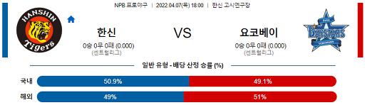 전일 경기에서는 요코베이가 12회 연장전 승부 끝에 6-1 승리를 기록하며 화요일 경기 패배를 설욕하면서 시리즈 균형을 맞추는데 성공했다. 2연패에서 벗어나는 승리가 나왔으며 시즌 5승5패 성적. 9회초, 2사 2루에서 마키의 적시타가 나오면서 극적으로 동점을 만들고 연장 12회에는 타자 9명이 타석에 들어오며 빅이닝(5득점)을 만들어 낸 경기. 반면, 한신은 개막 9연패에서 벗어나는 승리가 나온 이후 승리를 눈앞에서 놓쳤고 시즌 1승10패 성적. 2경기 연속 선발 투수가 9이닝을 책임졌지만 뒷심 대결에서 밀린 경기. 전일 경기에서 홈런포를 쏘아 올리며 난세의 영웅이 되었던 사토 아키라가 이날 경기에서는 5안타 무안타로 침묵하면서 찬스를 살리지 못했다. 선발 싸움에서는 이시다 켄타 투수가 상대적으로 더 좋은 리듬을 보여주고 있지만 개막 9연패에서 벗어난 한신이 답답한 실타레를 풀었고 전일 경기에서 불펜의 소모가 없었다는 것을 체크해야 한다. 한신 승리 가능성을 추천 한다.