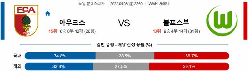 분데스리가 4월 3일 22:30 FC 아우크스부르크 : VfL 볼프스부르크