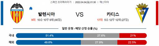 프리메라리가 4월 4일 01:30 발렌시아 : 카디스 CF