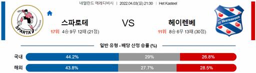 에레디비시 4월 3일 21:30 스파르타 로테르담 : SC 헤이렌베인