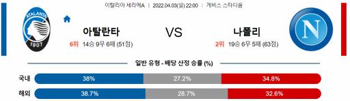 세리에A 4월 3일 22:00 아탈란타 BC : SSC 나폴리