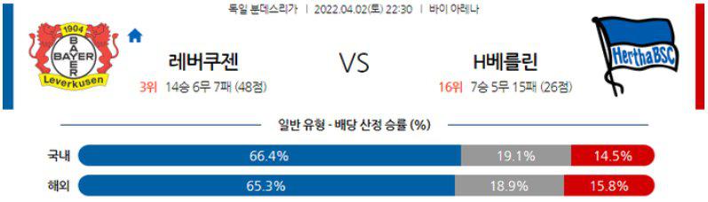 헤르타베를린의 수비능력을 고려하면 공격진 누수에도 불구하고 레버쿠젠의 손을 들어주는 것이 옳다. 다만 공격진 누수로 인해 최근 화력이 저하된 모습을 보이고 있음을 고려하면 대량 득점은 어려울 가능성이 있다. 핸디(-1.0) 승까지는 노려볼 만 하나, 스코어 선택은 신중을 기해야 한다.