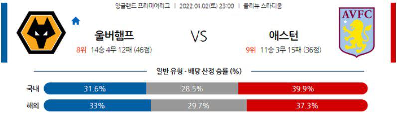 【프리미어리그】 4월 2일 울버햄튼 vs 아스톤 빌라
