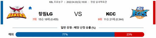 엘지의 승리를 본다. 두 팀은 이관희와 이정현의 악연이 늘 화제가 되는데 이 경기에서는 그 점이 덜 부각될 것이다. 특히, 30대 중반의 나이로 접어든 베테랑 이관희가 승리가 필요한 상황에서 의미없는 신경전을 걸지 않을 것이다. 라타비우스 윌리엄스가 최근 20분 정도를 출전 중인 원정팀인데 마레이가 골밑에서 확실한 존재감을 보일 엘지가 제공권 우위로 홈 승리를 가져갈 것이다. 엘지가 수비 집중력을 올릴 것이기에 언더 경기다.